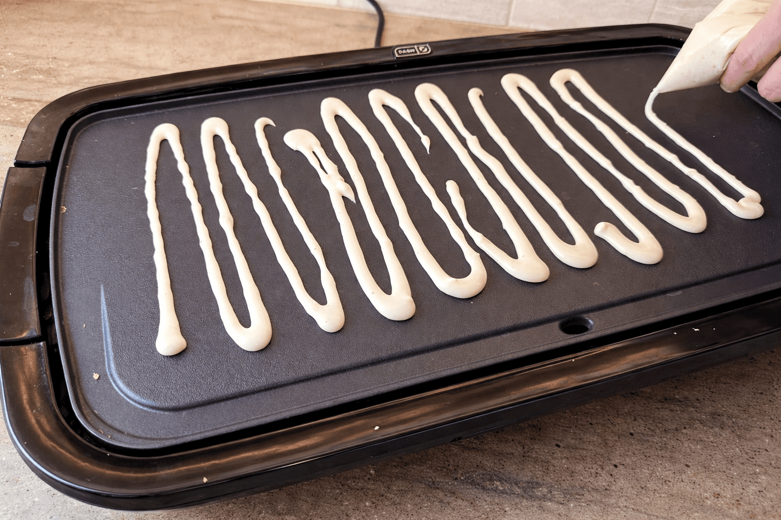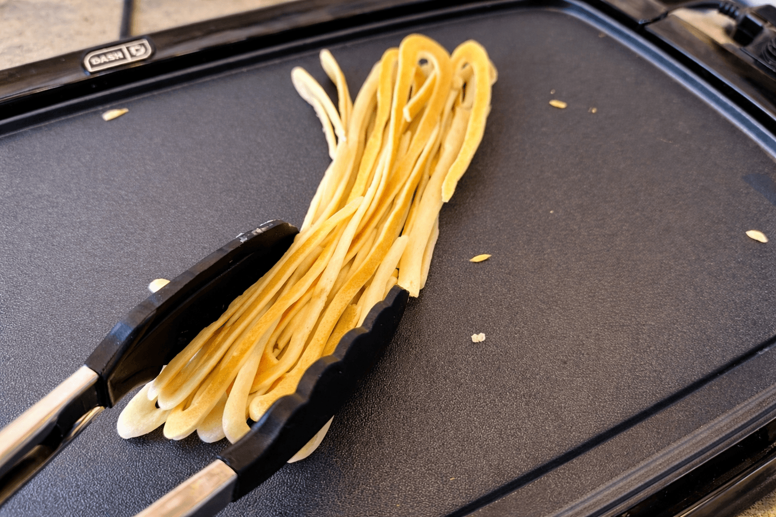 Let the batter cook until the bottom is lightly golden, then flip the strips just like you would a pancake. Once cooked, remove them from the griddle and pile them together to look like a small mound of spaghetti noodles.