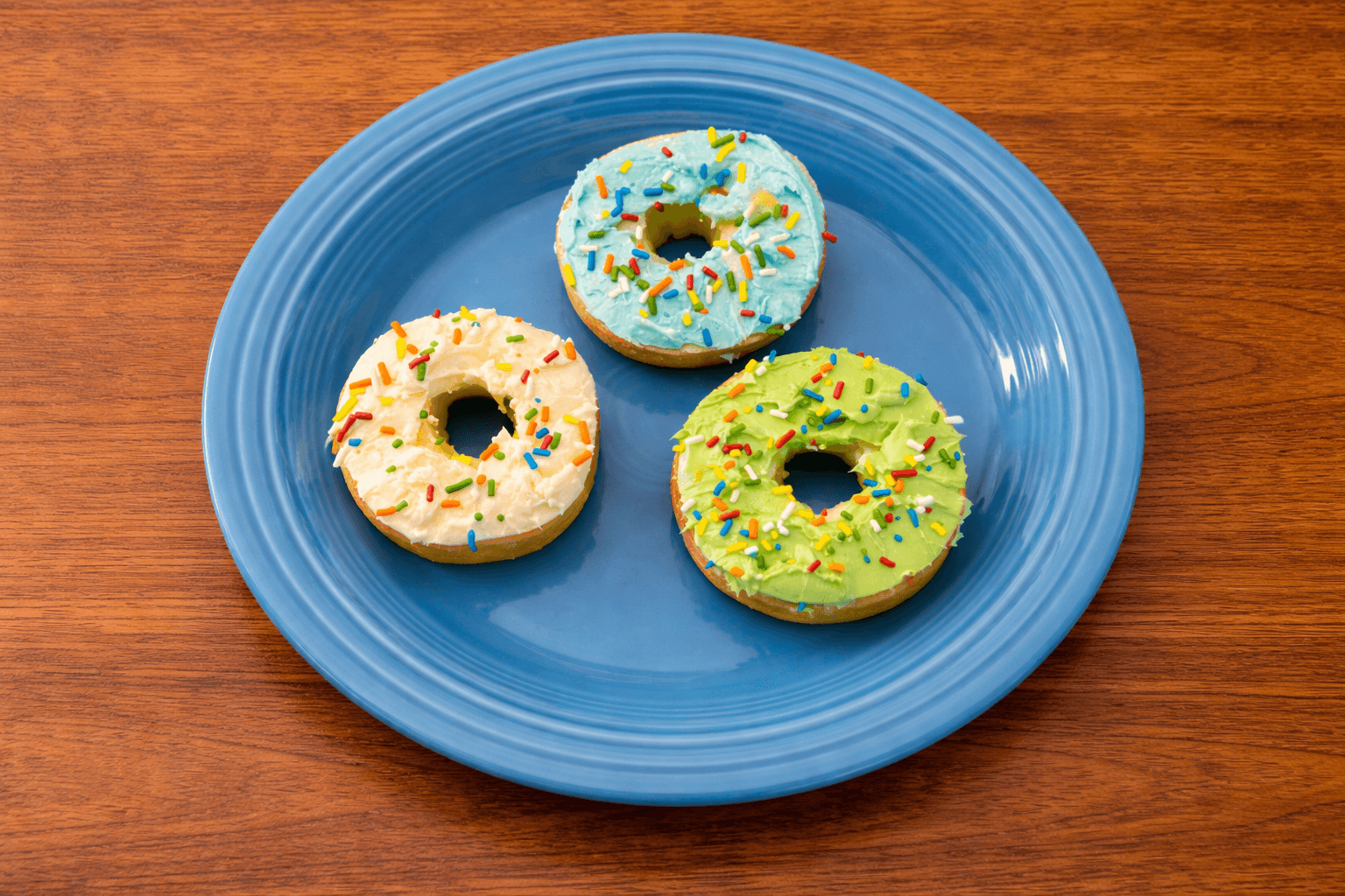 Another easy one we’ve done is “donuts” that are really apple slices topped with frosting and sprinkles. They look just convincing enough that the kids get excited… until they take the first bite.