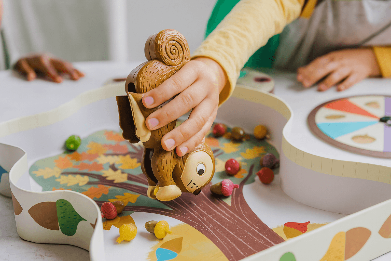 Players take turns spinning a spinner to determine their move. They pick up a specific color acorn, steal one from another player, lose a turn, or even have a windy day blow all your acorns away! Using the adorable squirrel-shaped “Squirrel Squeezer,” kids pick up and place acorns in their tree stump game board.